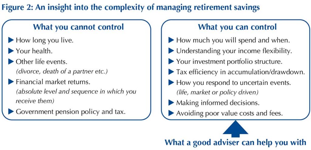 The figure below provides an overview of just how tricky this process is and how it must be an ongoing, dynamic process, not a one-off decision at retirement. Knowing what you cannot control and understanding what you can, provides some insight into the complexity of – and solutions to – retirement planning.